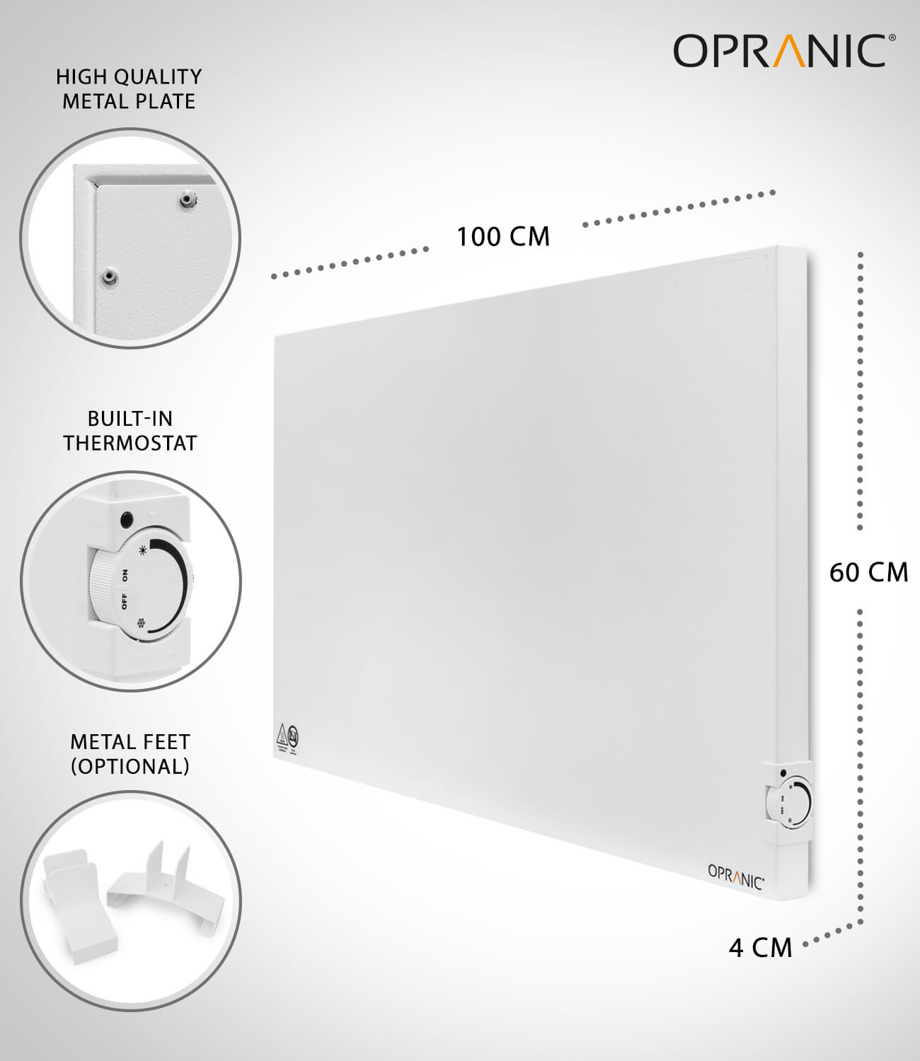 P6 Series has a built-in mechanical thermostat that allows for the adjustment of the heater’s surface temperature. The built-in thermostat regulates the heating output by adjusting the surface temperature of the radiator. Additionally, the P6 Hybrid Infrared Heater can be controlled with an external thermostat, which is not included in the product package. The choice of a suitable thermostat depends on the intended application. OPRANIC P6 Series Infrared Heaters have an open interface, making them compatible with any thermostat system. They are also designed for integration into smart home environments and are compatible with thermostats from other manufacturers.